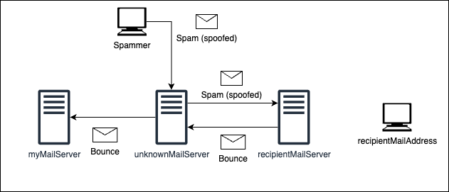 unknownMailServerbeimrecipientMailServergesperrt. - Infolge der Sperrung erfolgte eine Bounce-E-Mail, die durch die Catch-All-Regel an die gespoofte Absenderadresse auf