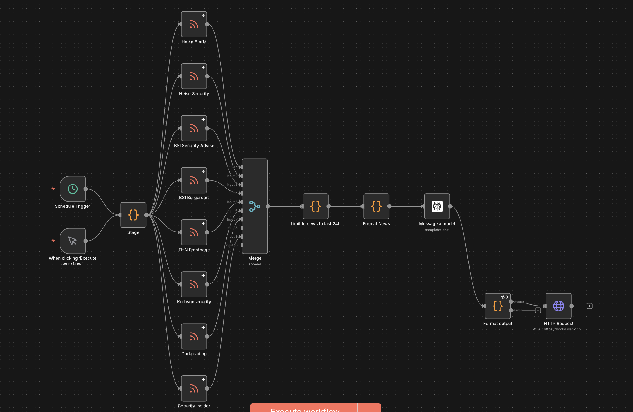 - RSS-Aggregation: n8n ruft mehrere definierte RSS Feeds ab und erstellt ein konsolidiertes JSON-Objekt