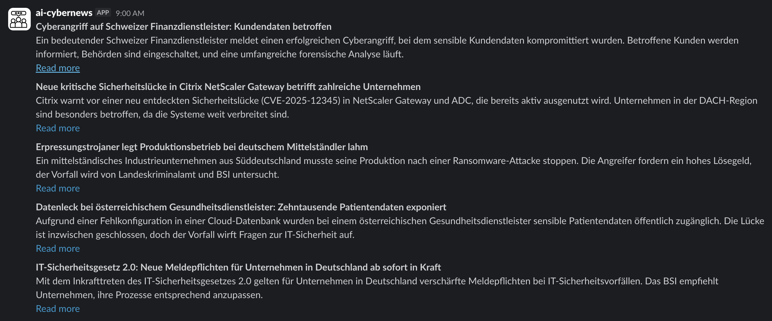 Das Ergebnis war deutlich besser. Keine halluzinierten Nachrichten mehr, keine 404-Fehler. Die Priorisierung der Inhalte durch die KI erwies sich als zuverlässig und relevant. Der Proof-of-Concept läuft bereits mehrere Wochen im Security Meetup Slack und erhielt durchweg positives Feedback. Die priorisierten Nachrichten stehen konsistent an erster Stelle der Liste.