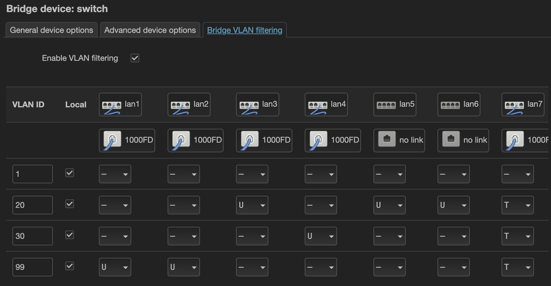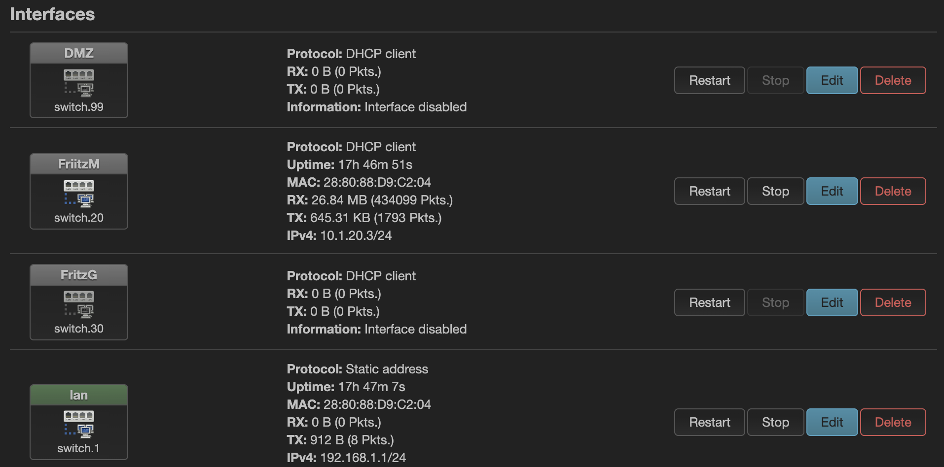 Initial war auf dem Switch jeweils ein Interface in jedem der VLANs aktiv, entsprechend war der Switch über mehrere Netze ansprechbar. Nach etwas Recherche zeigte sich jedoch: Für das einfache Heimnetz genügt es, das Switch-Management auf ein VLAN zu beschränken. In diesem Fall war das VLAN 20. Firewall-Regeln, die den Zugang aus anderen VLANs sperren, sorgen für zusätzliche Sicherheit – obwohl sie bei nur einem aktiven Management-Interface eher eine zweite Verteidigungslinie darstellen.