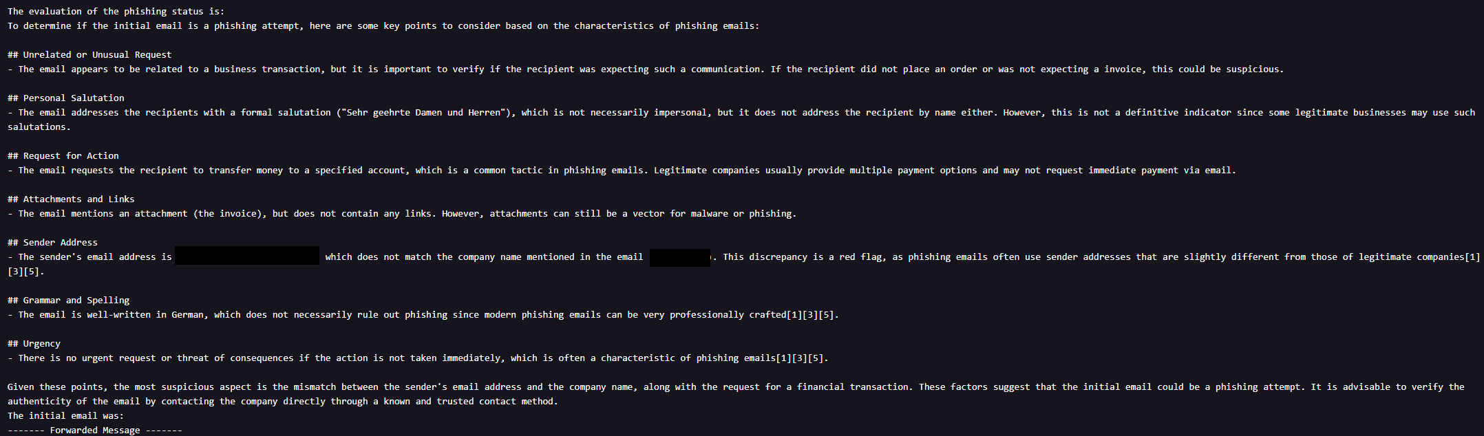 - Ein definierter Kontext, der Perplexity dazu auffordert, die Wahrscheinlichkeit eines Phishing-Versuchs einzuschätzen und darauf hinweist, dass es sich um eine weitergeleitete E-Mail handelt.
